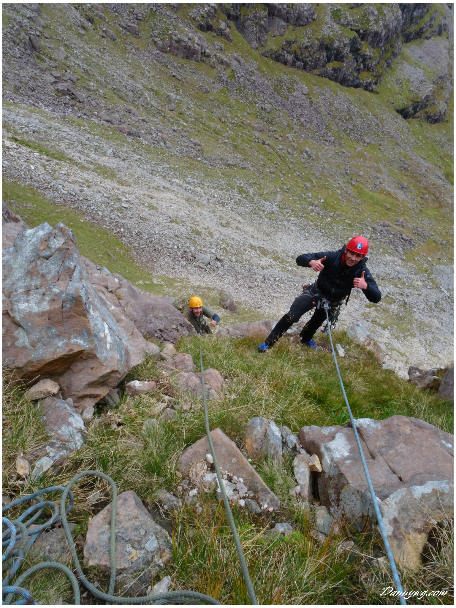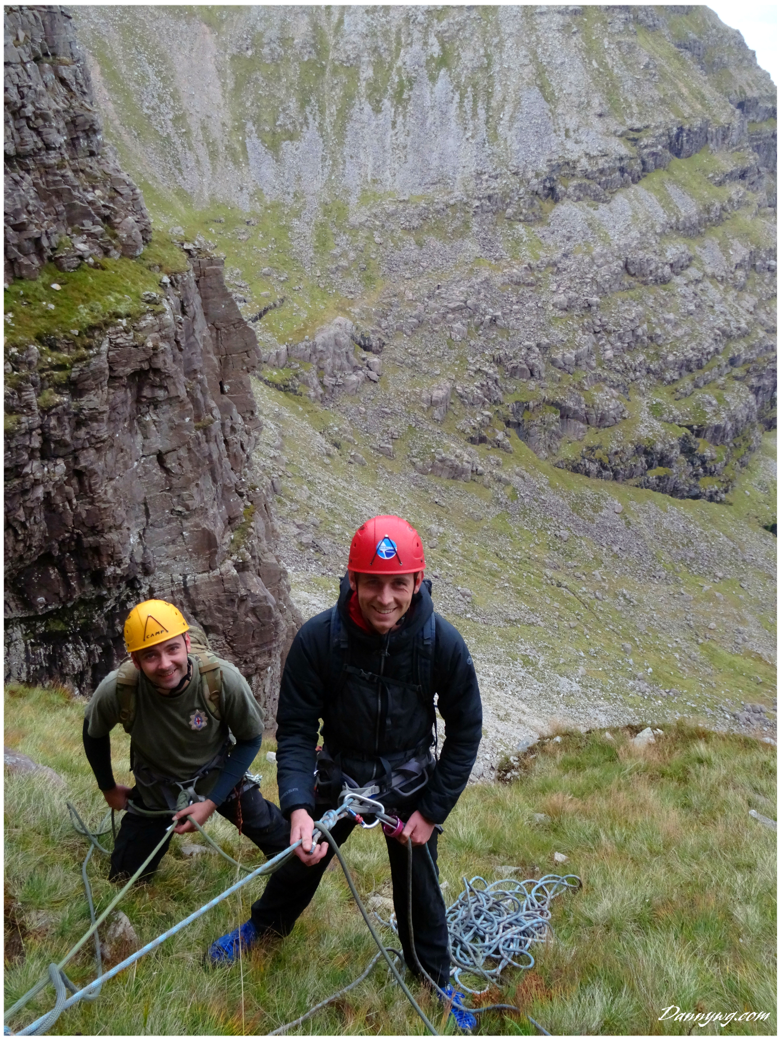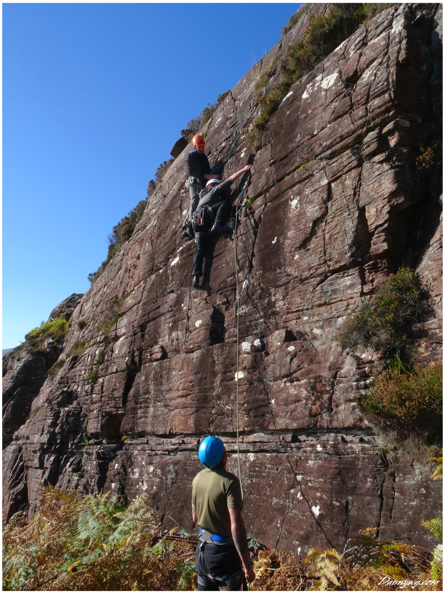 After completing a 5 day intro to climbing course I was hired by the group to lead a guided climbing trip up the ‘Triple Buttresses’ of Ben Eighe in Torridon. I guided two of the group, Garry and Scotty, up Hamilton’s Route 280 m, the first third being on Sand Stone and the last two thirds on Quartzite. It’s a real mountain route with 2 hours walk in and some very loose blocks (easily avoided). We managed to time it so we saw the sun set just as we topped out, epic!. Then it was a walk back to the van with head touches.