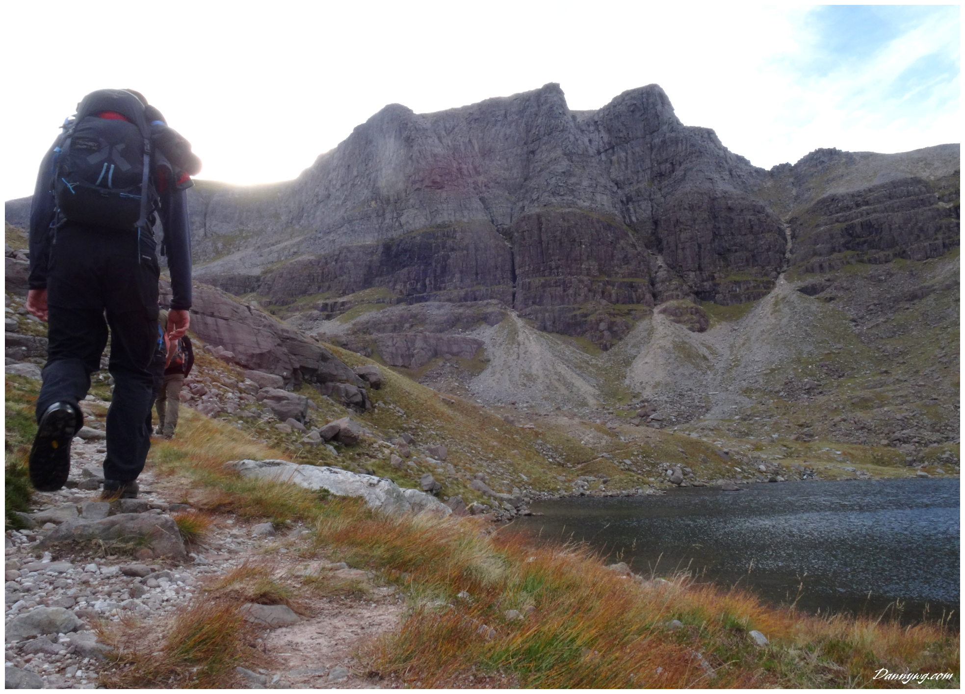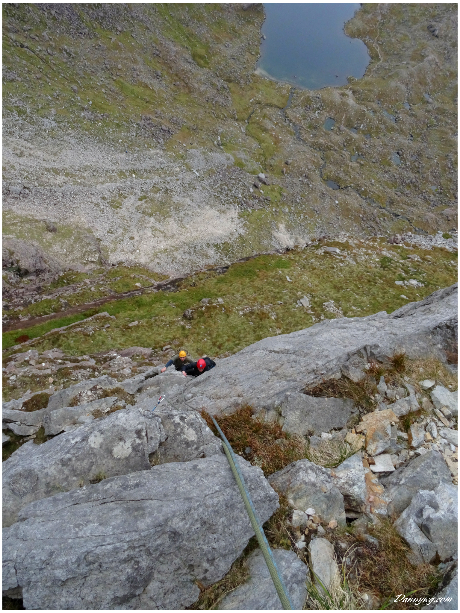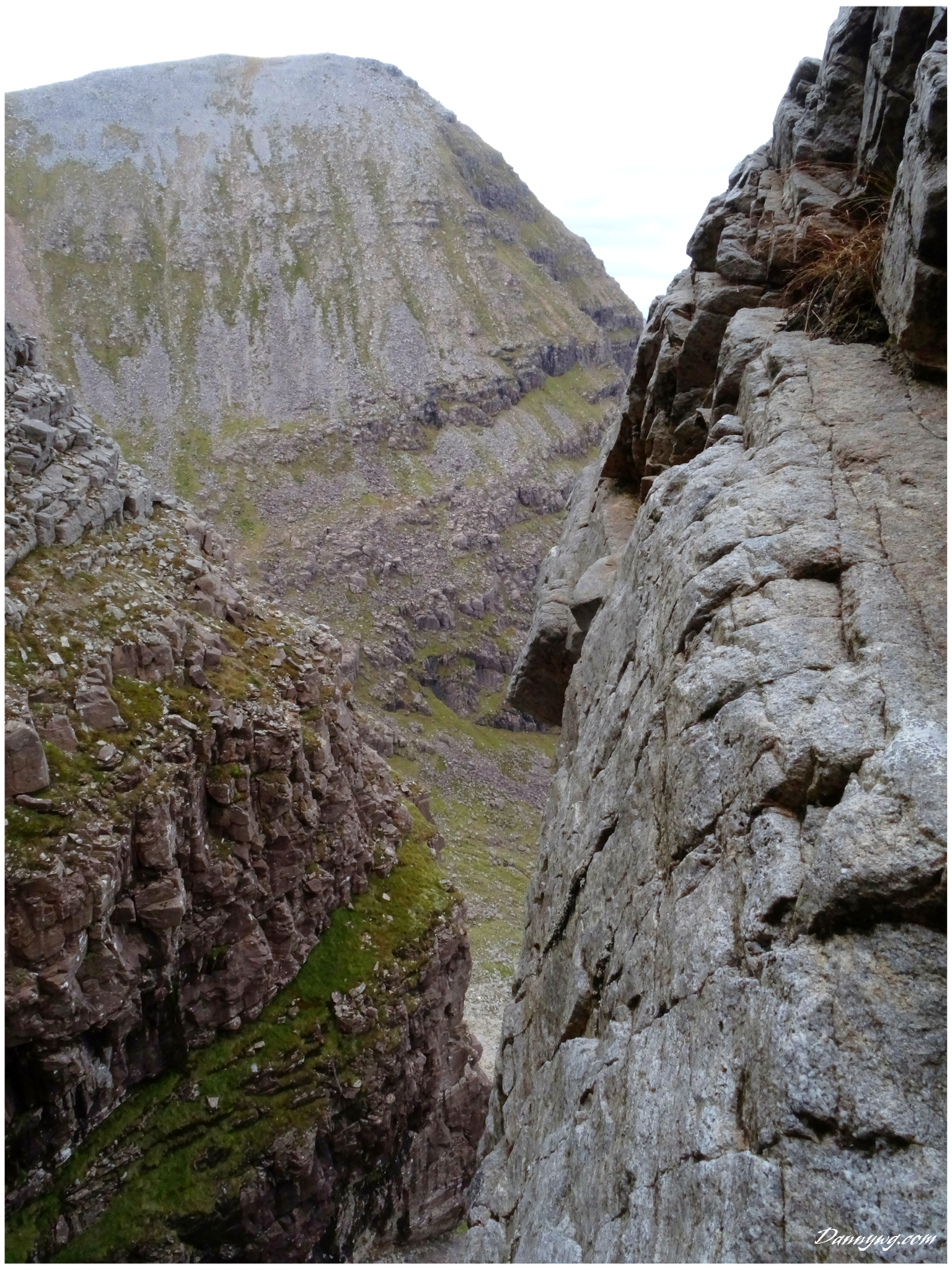 After completing a 5 day intro to climbing course I was hired by the group to lead a guided climbing trip up the ‘Triple Buttresses’ of Ben Eighe in Torridon. I guided two of the group, Garry and Scotty, up Hamilton’s Route 280 m, the first third being on Sand Stone and the last two thirds on Quartzite. It’s a real mountain route with 2 hours walk in and some very loose blocks (easily avoided). We managed to time it so we saw the sun set just as we topped out, epic!. Then it was a walk back to the van with head touches.