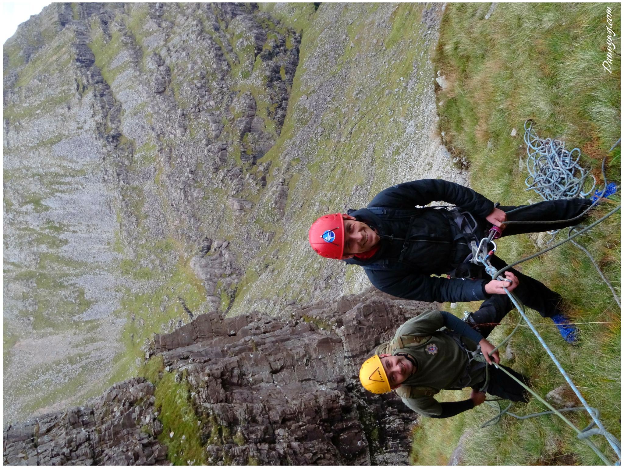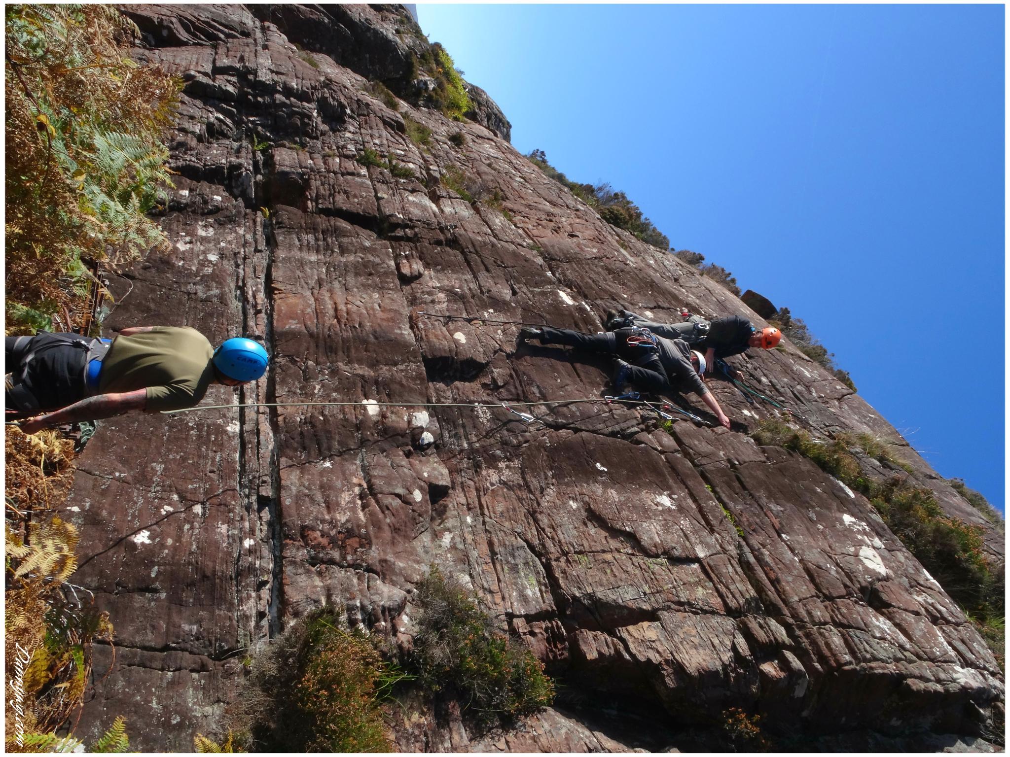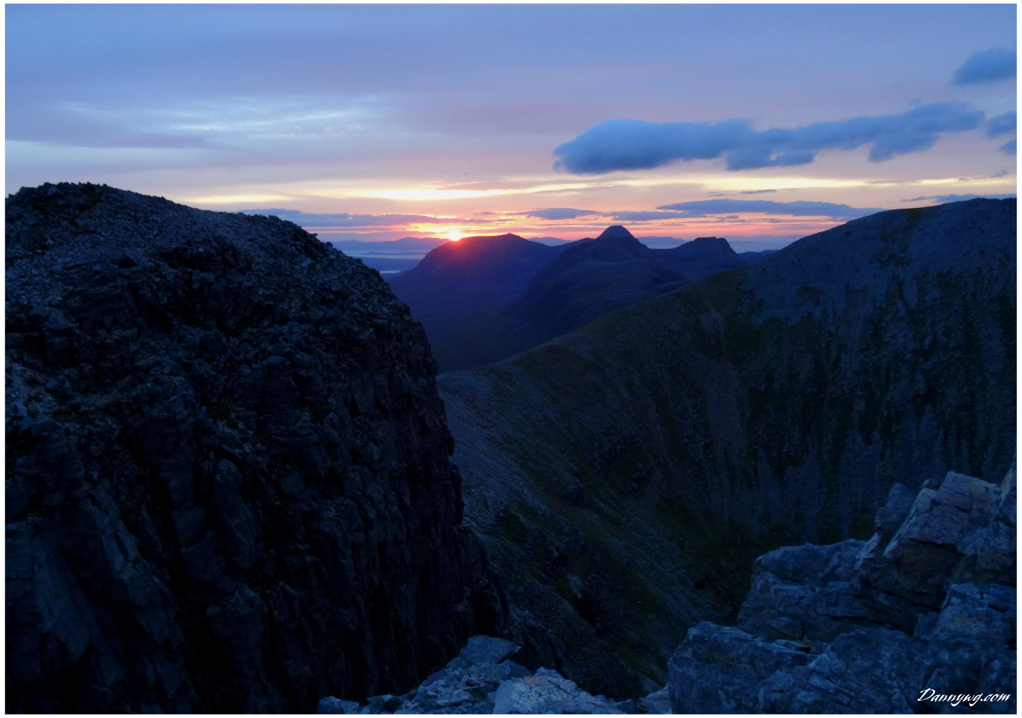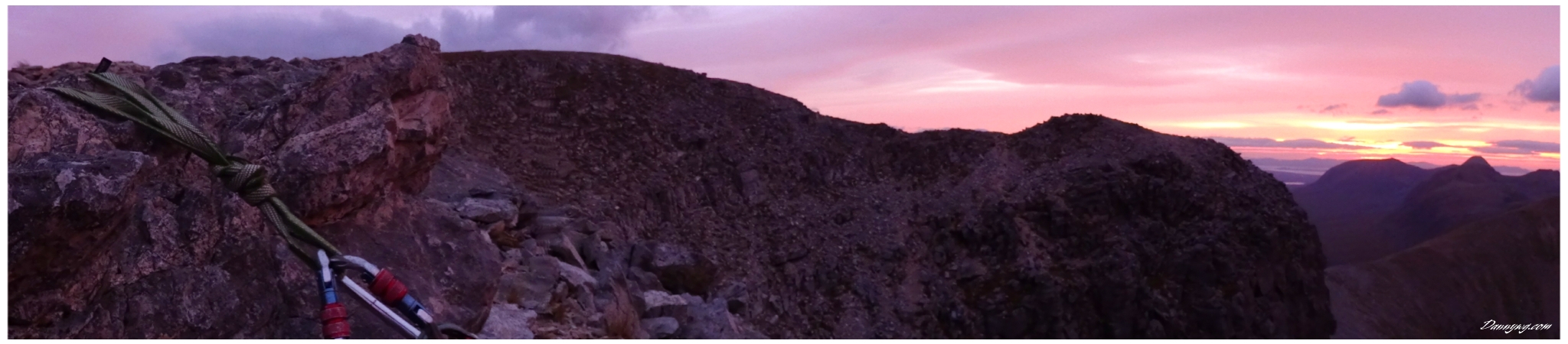 After completing a 5 day intro to climbing course I was hired by the group to lead a guided climbing trip up the ‘Triple Buttresses’ of Ben Eighe in Torridon. I guided two of the group, Garry and Scotty, up Hamilton’s Route 280 m, the first third being on Sand Stone and the last two thirds on Quartzite. It’s a real mountain route with 2 hours walk in and some very loose blocks (easily avoided). We managed to time it so we saw the sun set just as we topped out, epic!. Then it was a walk back to the van with head touches.