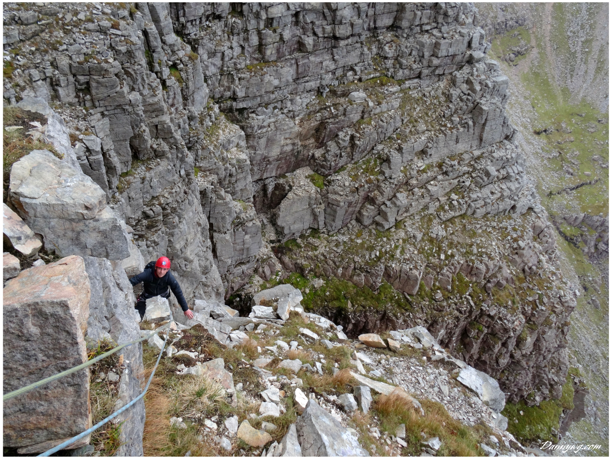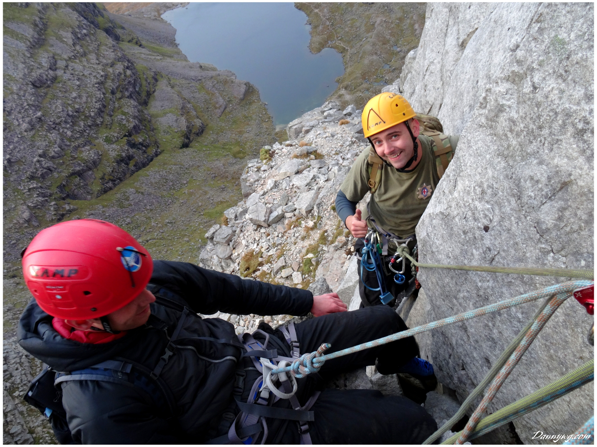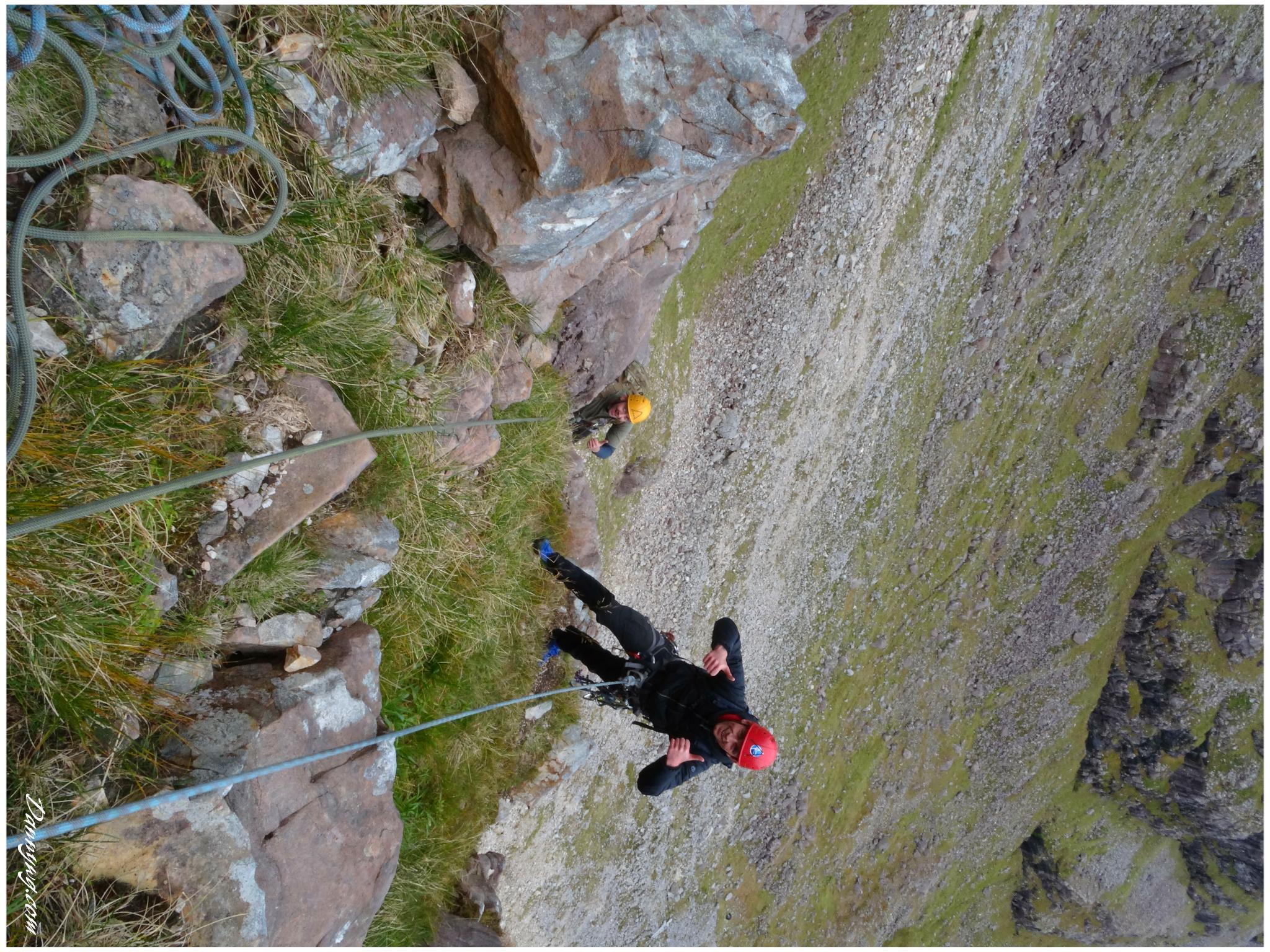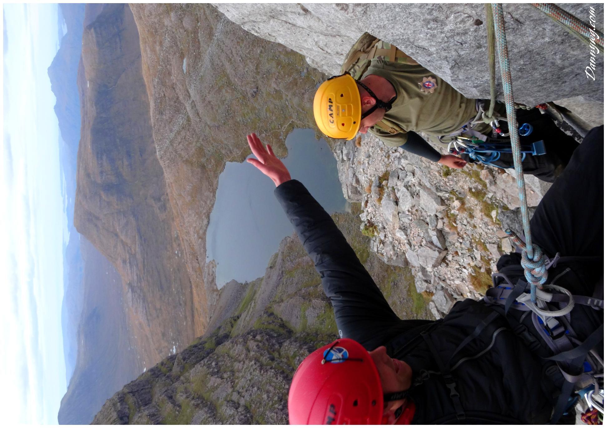 After completing a 5 day intro to climbing course I was hired by the group to lead a guided climbing trip up the ‘Triple Buttresses’ of Ben Eighe in Torridon. I guided two of the group, Garry and Scotty, up Hamilton’s Route 280 m, the first third being on Sand Stone and the last two thirds on Quartzite. It’s a real mountain route with 2 hours walk in and some very loose blocks (easily avoided). We managed to time it so we saw the sun set just as we topped out, epic!. Then it was a walk back to the van with head touches.